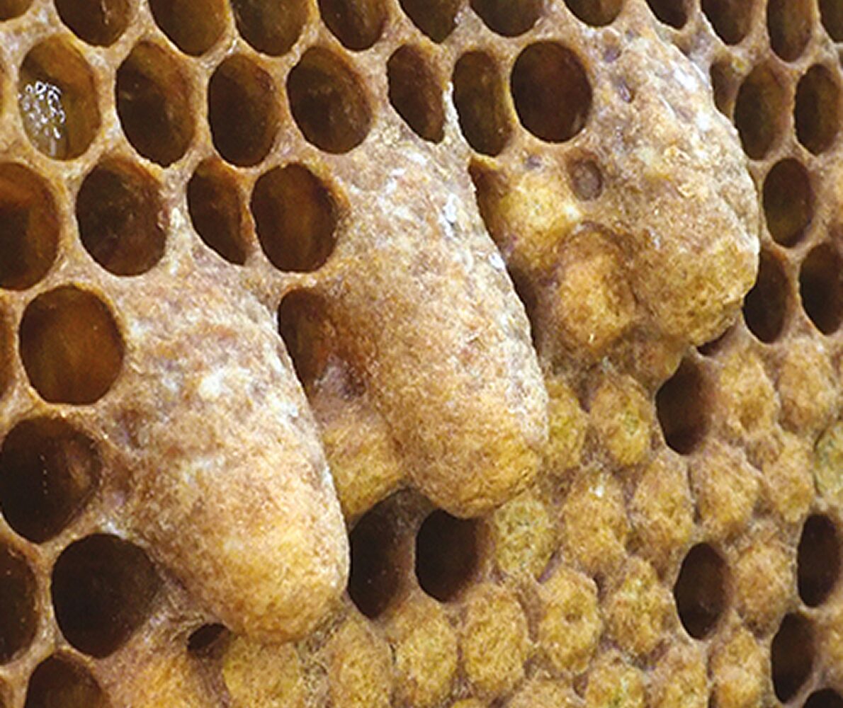 Chalkbrood infection is easy to recognise: larvae will initially be covered by fluffy, white fungus which then dries out and shrinks to form a distinctive mummified chalk-like appearance. Like many brood disorders, there may be perforated cappings where bees have attempted to investigate what is going on underneath. Workers will uncap and remove infected chalkbrood cells, resulting in an uneven or pepperpot brood pattern. The chalkbrood mummies removed by the workers can be found on the floorboard or outside the entrance. Chalkbrood mummies are fairly distinctive but could easily be confused with mouldy pollen. However, when rubbed between two fingers the mouldy pollen will break up easily, whereas a mummified chalkbrood larva is hard to crush between the fingers.