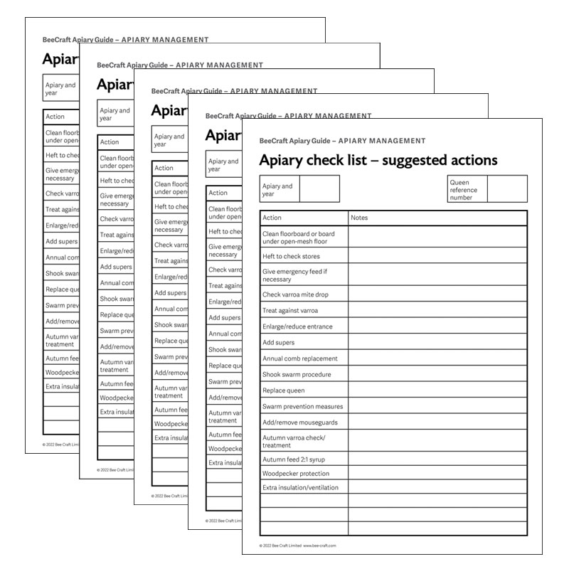 The Bee Craft Apiary Record Pack can be used to record management techniques, disease inspections and varroa treatments for an apiary of up to five colonies. It includes an instruction sheet, an example and facilities for recording veterinary medicines, five queen and colony record cards and five check lists.