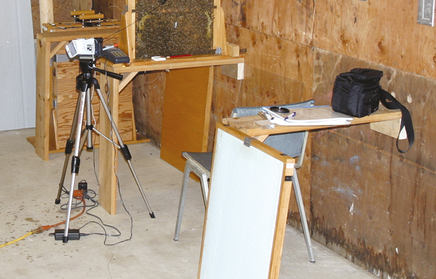 Photo 1: The corner in a barn where we set up three observation hives. Plastic tubes between the hive entrances and two holes drilled in the barn door enabled the bees to fly outside. This photo shows one observation hive already installed and the two stands for the other two hives. The two window-walls of each hive were usually covered with insulation boards, one of which is shown leaning against the nearest hive stand.