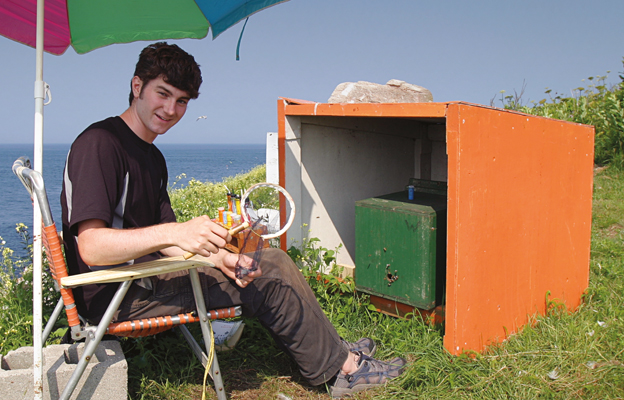 Photo 2: Nestbox (green) mounted in a small lean-to shelter for protection from the wind, sun, and rain. It was positioned 225 metres from the three observation hives. The Atlantic Ocean extends to the east in the background. Sean Griffin sits in front of the nest box and is holding a paint set and a small insect net. When an unmarked scout bee was seen entering the nest box, Sean captured her when she came out by holding the net over the entrance hole. He then pinned her gently between folds of the netting and applied a dot of paint to her thorax. Then he released her and recorded the marking so that we could tally the number of scout bees that had visited the box. Scouts showed no sign of being disturbed; nearly all went back into the nest box to continue their inspections.