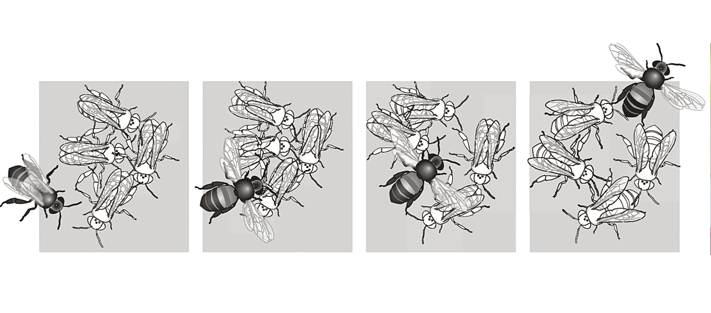 Panel 4: The buzz-runner has broken contact with the bees but continues buzzing her wings as she runs on. Sequence based on frames from a video-recording.