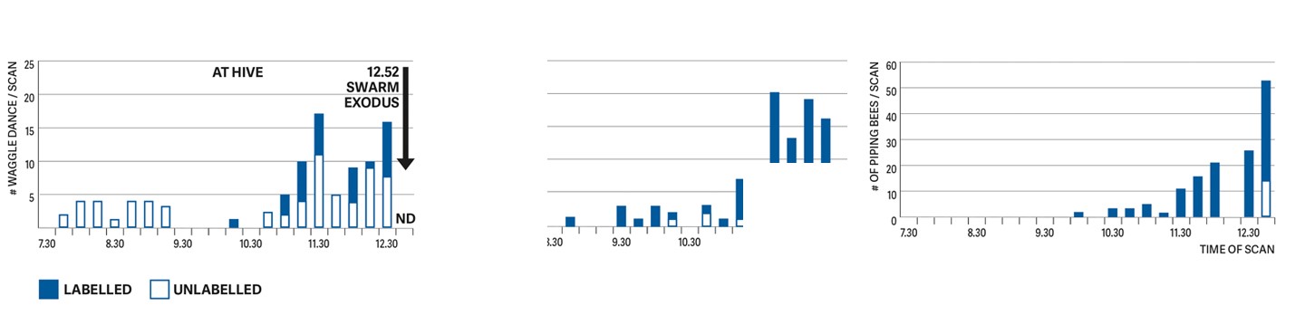 Signal intensities in Colony 1 as its bees prepared for the departure of its swarm. Left: waggle dancers. Middle: buzz-runners. Right: pipers. Each bar shows the number of labelled bees (known nest-site scouts) and unlabelled bees. The swarm departed from the hive at 12:52pm. The diagram shows that in the hour before the swarm emerged from Colony 1, nearly every worker bee that was a buzz-runner or a piper was a nest-site scout.